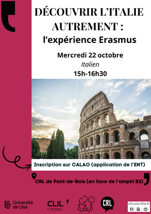 CRL Campus Pont de Bois - "Découvrir l'Italie autrement : l'expérience Erasmus" - Atelier d'Italien le 22.10 de 15h à 16h30