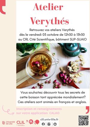 Retrouvez vos ateliers Verythés dès le vendredi 03 octobre de 12h30 à 13h30 au CRL sur le campus Cité Scientifique (salle n°19 bâtiment SUP-SUAIO).