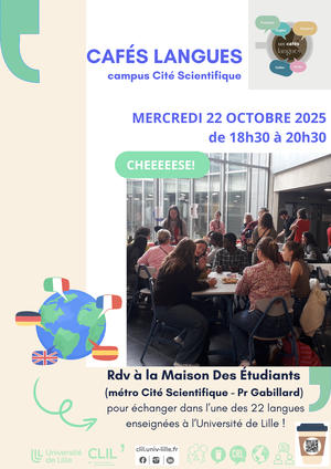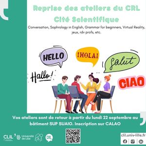 Vous pouvez, à tout moment, découvrir ci-dessous l'ensemble des ateliers et/ou autres évènements se déroulant aux CRL ou Centre de Ressources en Langues et/ou sur les campus de l'Université de Lille, et relatifs au CLIL.