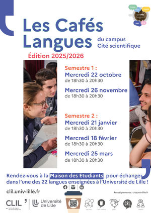 Dès le lundi 22 Septembre, le CRL du campus Cité Scientifique (salle n°19 - bâtiment SUP/SUAIO) lance sa série d’ateliers de conversation en langues spécialement pensés pour les étudiants de l’Université de Lille.
